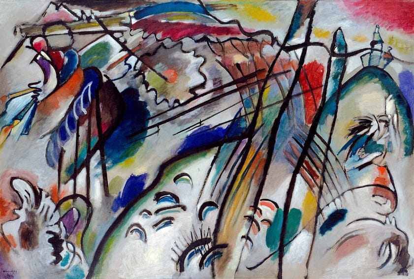 Improvisation 28 (Second Version) (1912) by Wassily Kandinsky abandons the expectation that painting must represent external objects. Instead, it constructs a visual field organized through internal relations—line, colour, and directional force. Elements do not describe a scene; they interact, forming a structure apprehended through movement rather than recognition.